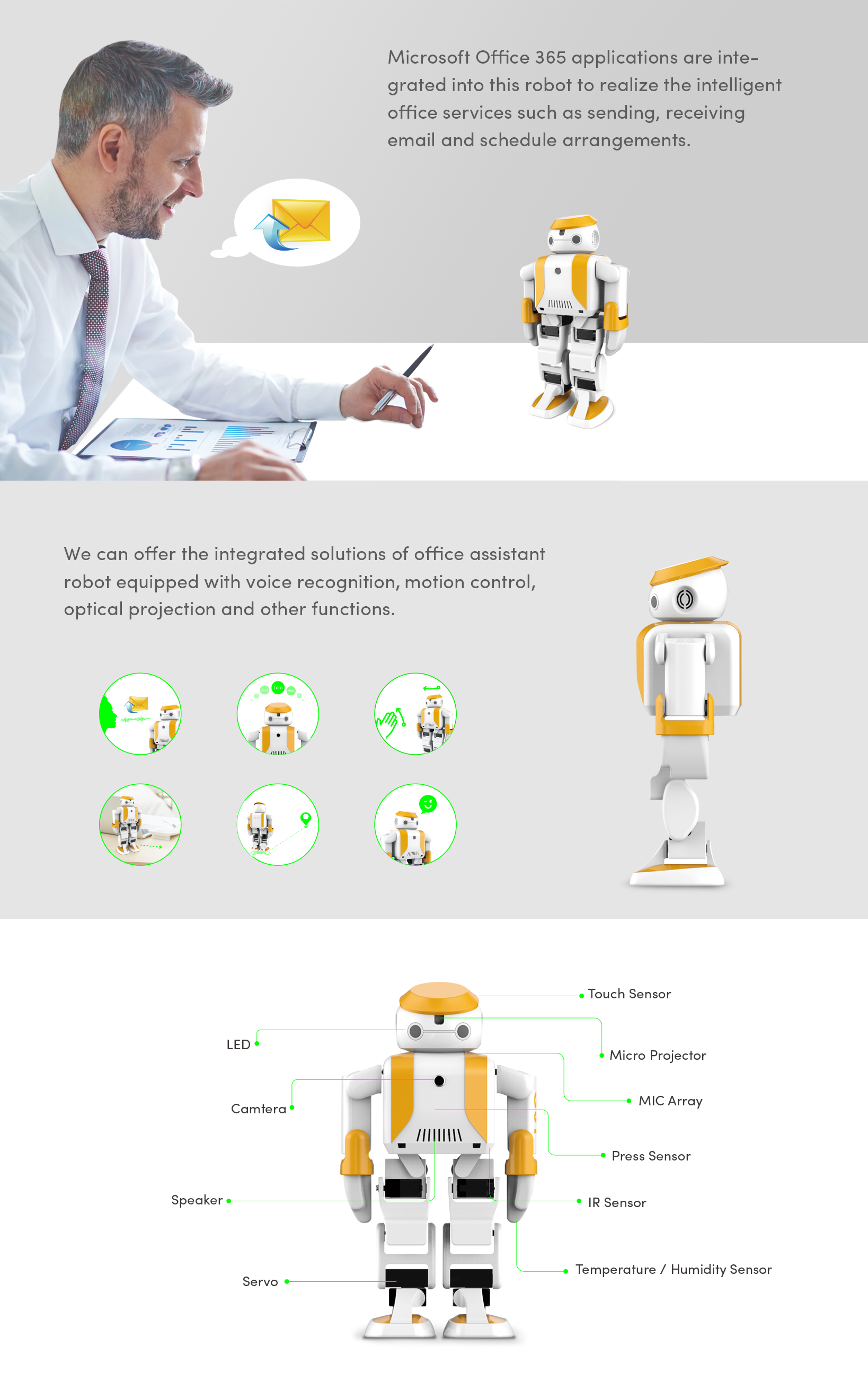 Microsoft Office 365 applications are integrated into this robot to realize the intelligent office services such as sending, receiving email and schedule arrangements. Funchtions like voice recognition, motion control, optical projection and others make its using more convenient and intreresting.